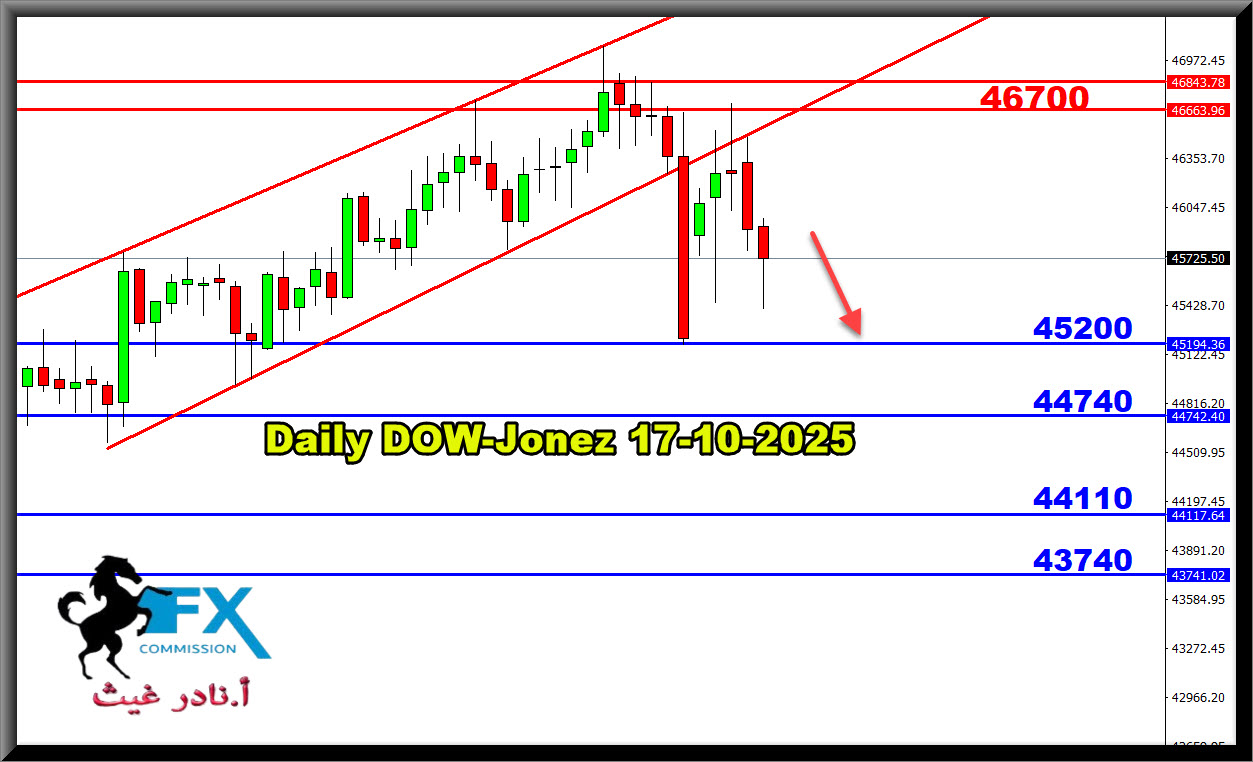|  رد: تحليل داو جونز DOW JONES Dow-Jonez 14/10/2025 مؤشر الداو جونز تعرض ضغوط للعودة للهبوط كما اشرنا امس وبفيديو السبت وذلك في ظل مخاوف تصاعد الحرب التجارية الأمريكية، تقنياً لفريم اليومي بقيت محاولات الارتفاع اسفل مستوى 46200، فيما العودة للهبوط تتطلع الى استهداف مستوى الدعم 45200 بشكل أولى وادنى من ذلك بمشيئة الله.  |