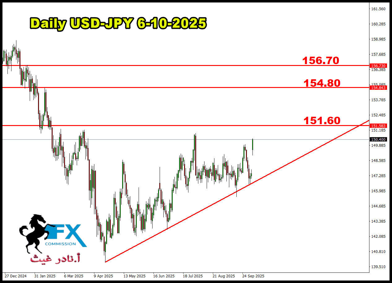 زوج دولار ين بعد فجوة سعرية كبيرة جداً لا زالت مفتوحة حتى الان بسبب فوز تاكايشي برئاسة الحزب الليبرالي الديمقراطي الذي لا يؤيد رفع الفائدة ادى الى ضعف كبير للين، كان بالسابق توقعات 60% لامكانية رفع الفائدة على الين نهاية الشهر، اما بعد فوز تاكايشي اصبحت 18% فقط، عموماً الصعود الحالي تقنياً يستهدف المقاومة الأولية على 150.00 - 151.60 تقريباً.